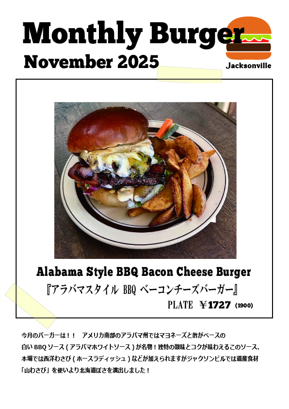 11月のバーガー『Alabama Style BBQ Bacon Cheese Burger』 公開日: 2025.12.20 今月のバーガーは!! アメリカ南部のアラバマ州ではマヨネーズと酢がベースの白いBBQソース(アラバマホワイトソース)が名物!独特の酸味とコクが味わえるこのソース、本場では西洋わさび(ホースラディッシュ)などが加えられますがジャクソンビルでは道産食材「山わさび」を使いより北海道ぽさを演出しました!